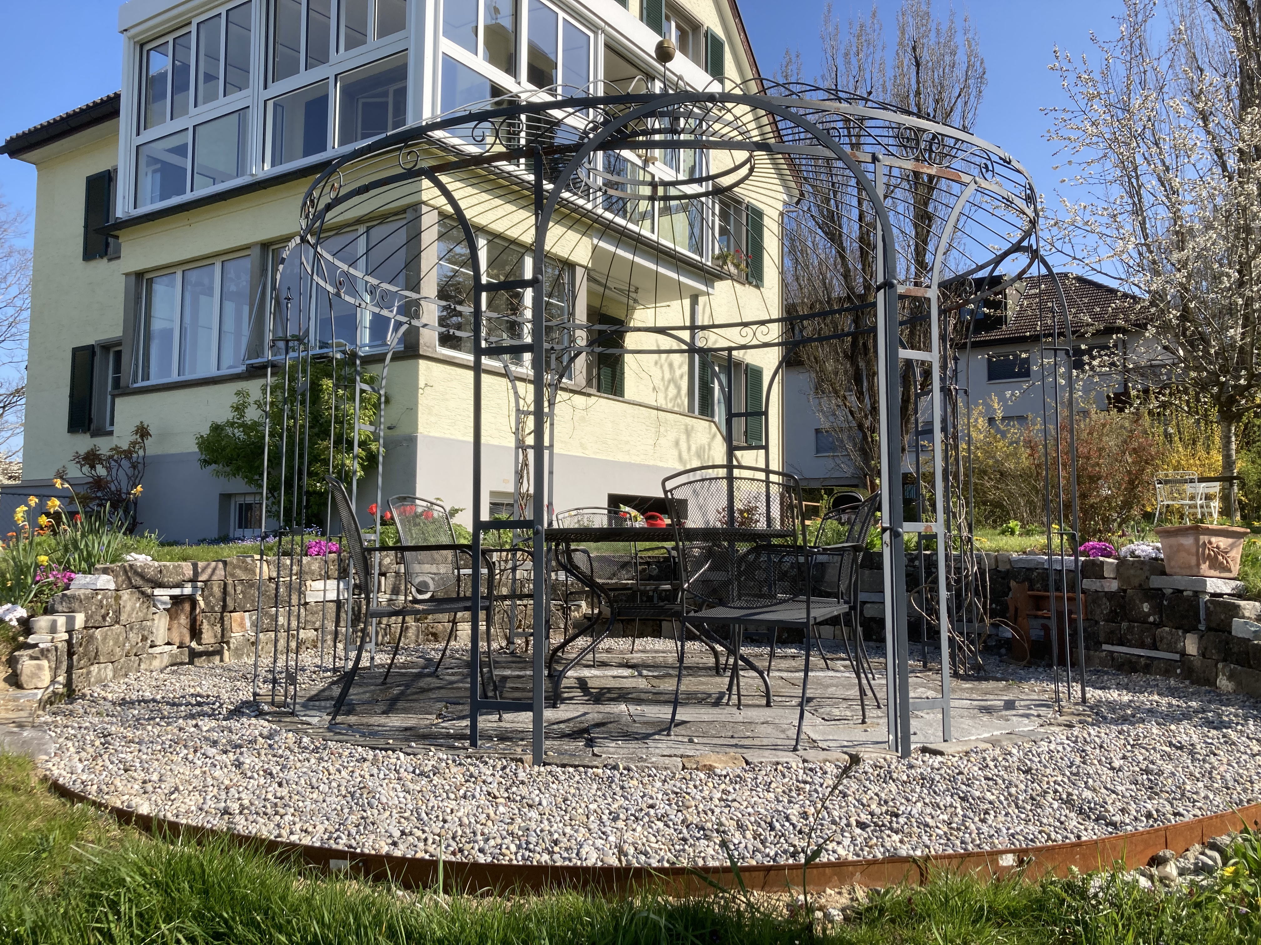 Als Mittelpunkt des Sitzplatzes dient ein Laube aus Metall. Angepasst an die runde Form der Laube wurde eine Recycling Mauer mit wiederverwendeten Steinen aus diesem Garten angelegt. Der Belag des Sitzplatzes besteht aus Gneisplatten, welche zuvor als Trittplatten gedient haben. Zur Böschung hin bildet eine Cortenstahl Rasenkante den Abschluss.