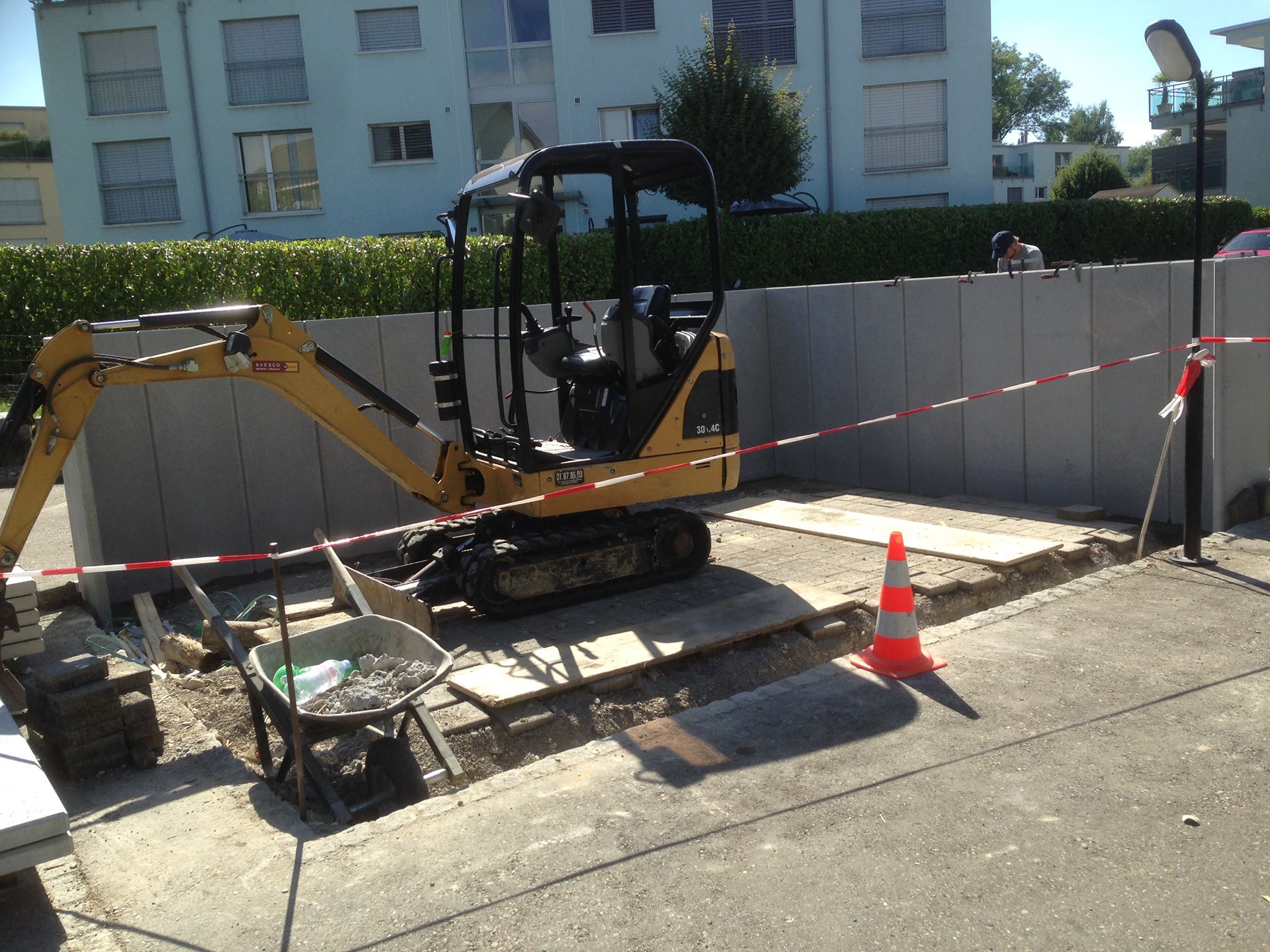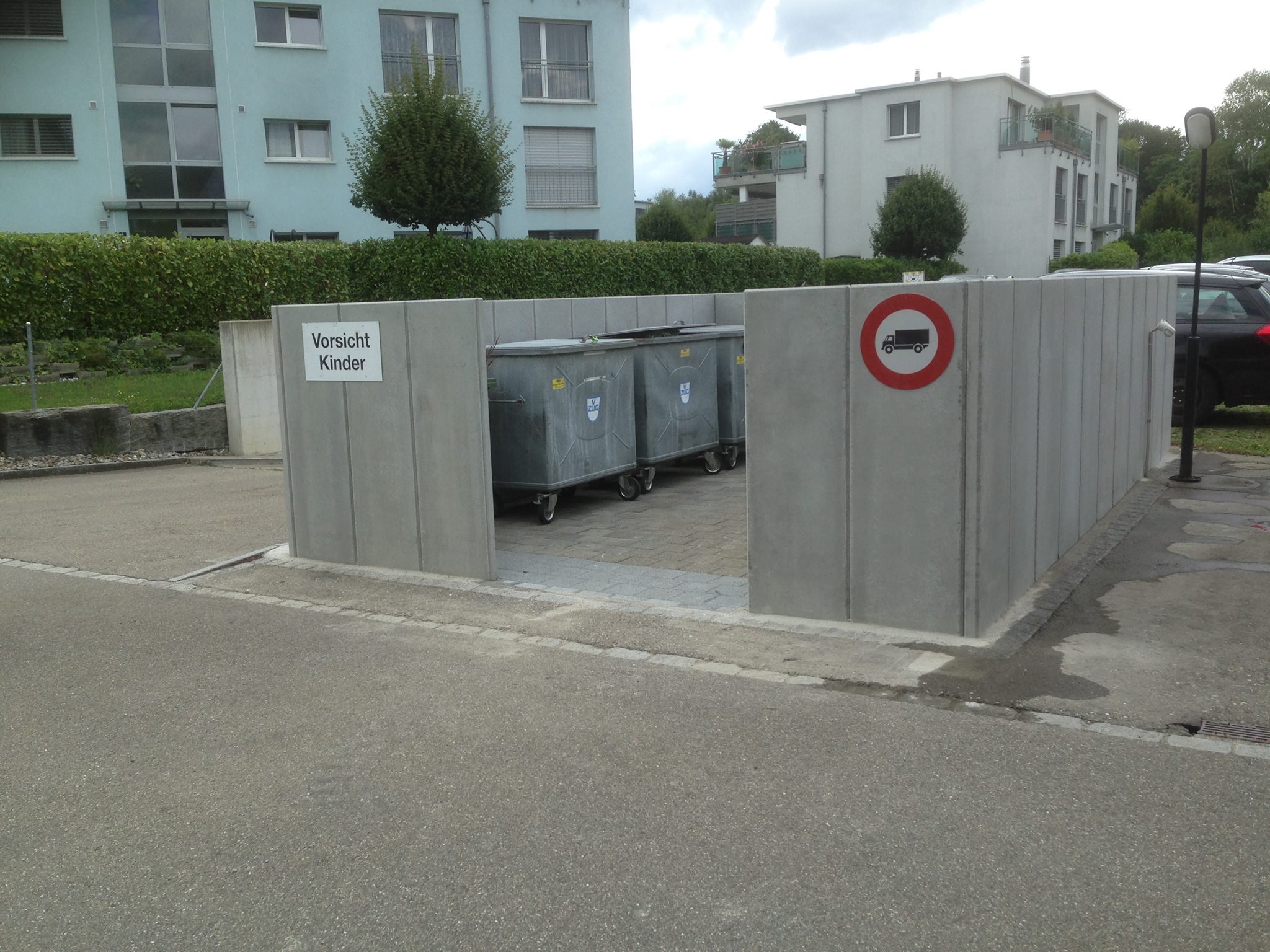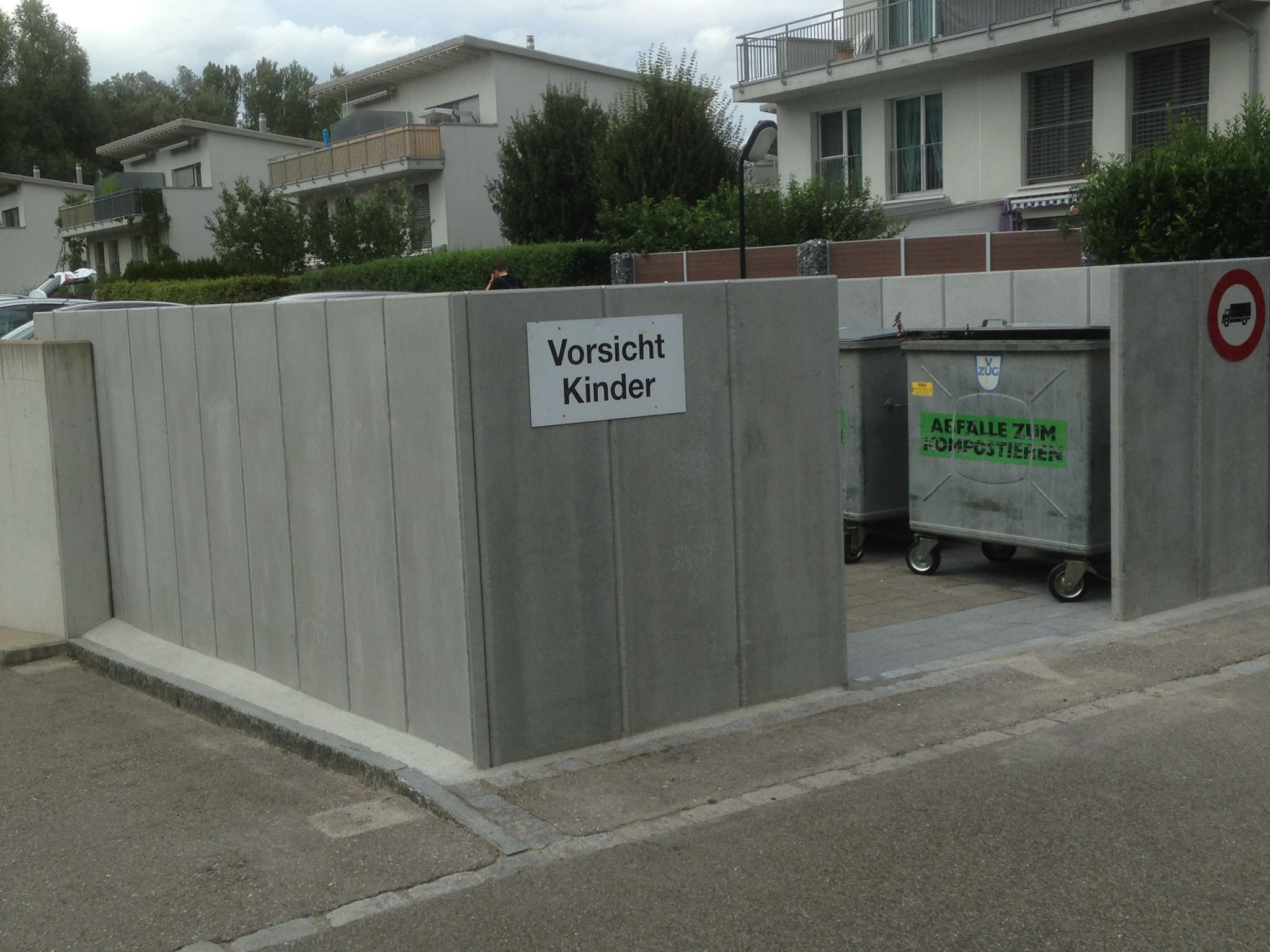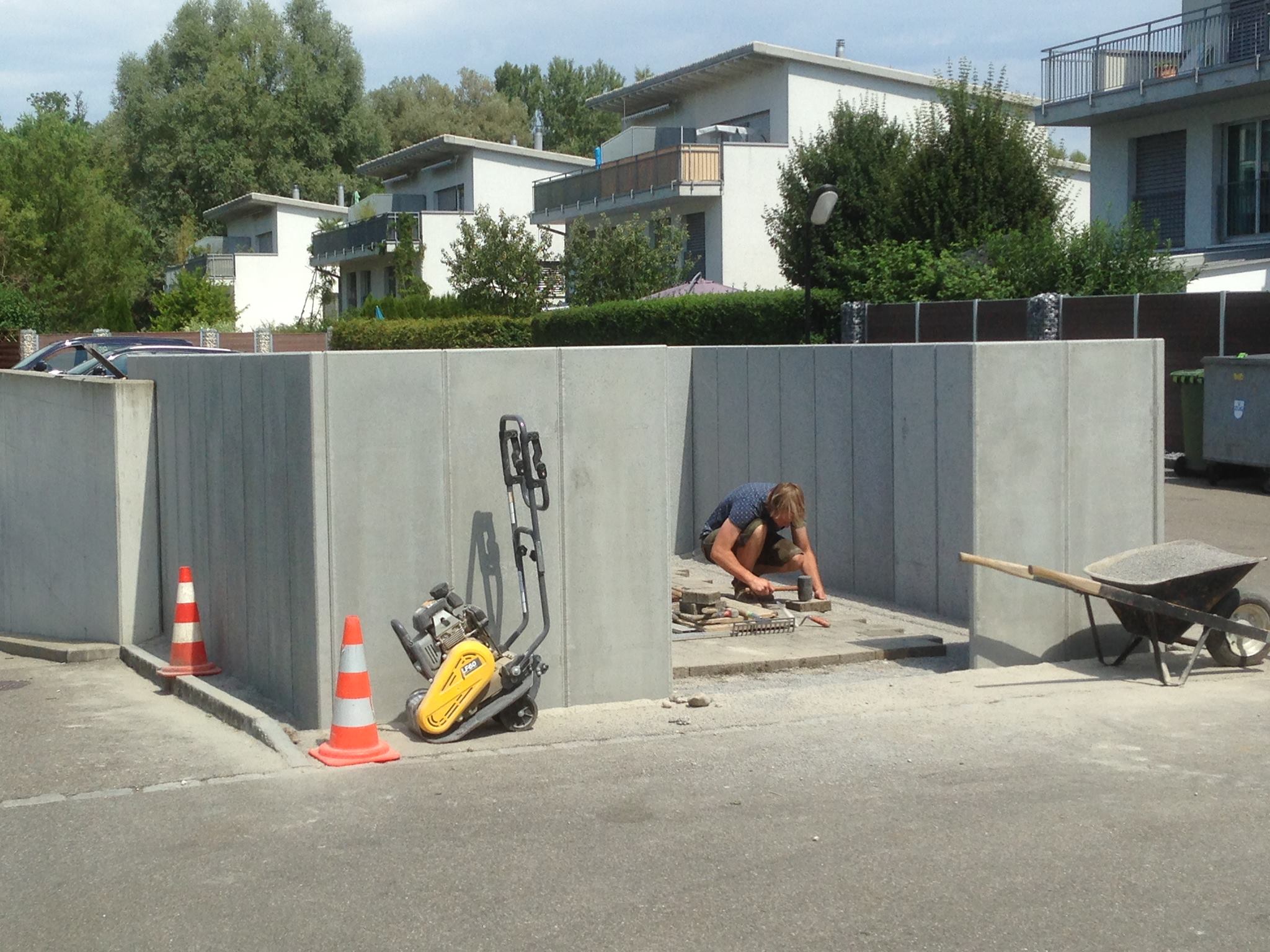 Der Auftrag war es, eine robuste und langlebige Einfassung für einen Containerplatz einer grossen Überbauung in Dübendorf zu erstellen. Die bestehenden Holzpalisaden wurden durch Betonbretter ersetzt.