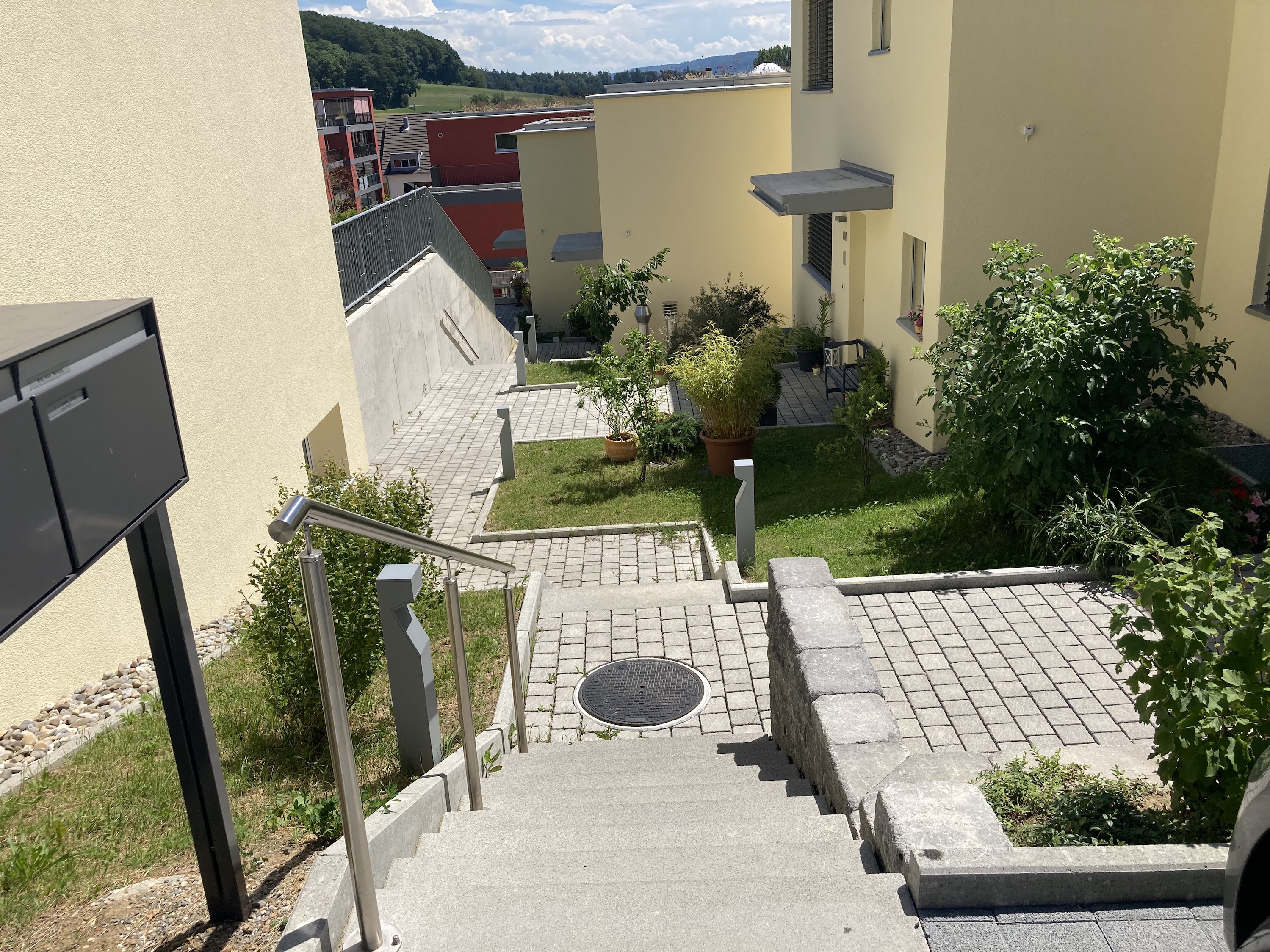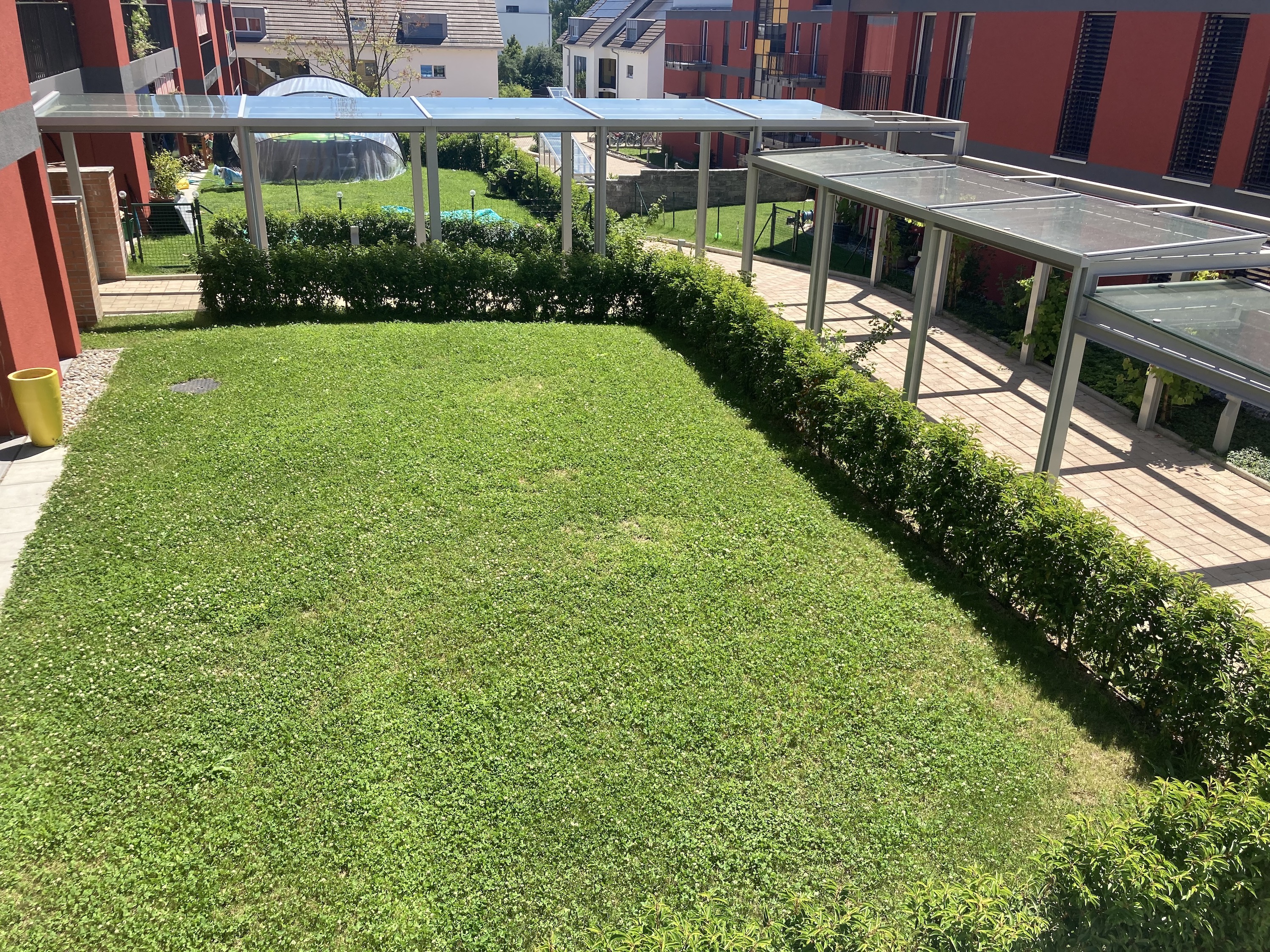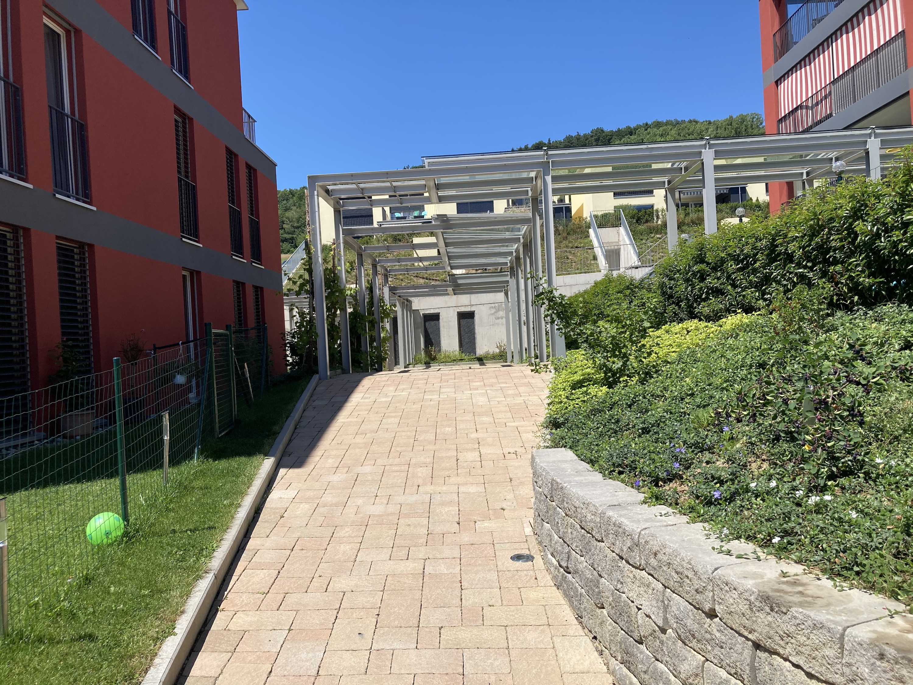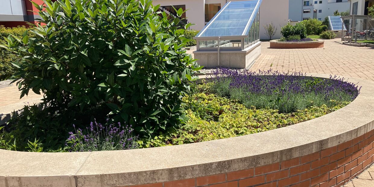 Es wurden Blumenwiesen und Rasenflächen angelegt, und auch ein Spielrasen haben wir erstellt. Die Bepflanzung ist geprägt von Nutzpflanzen. Überall auf dem Areal kann genascht werden. Von Kräutern über Beerensträucher bis hin zu Hochstämmer wurde alles gepflanzt. Zusätzlich sind vor jeder Wohneinheit Hecken gesetzt und die Böschungen mit Bodendeckern und Kleinsträucher bepflanzt worden. Üppige Staudenbeete findet man ebenfalls auf dem Areal. Bauphase 2019/2020