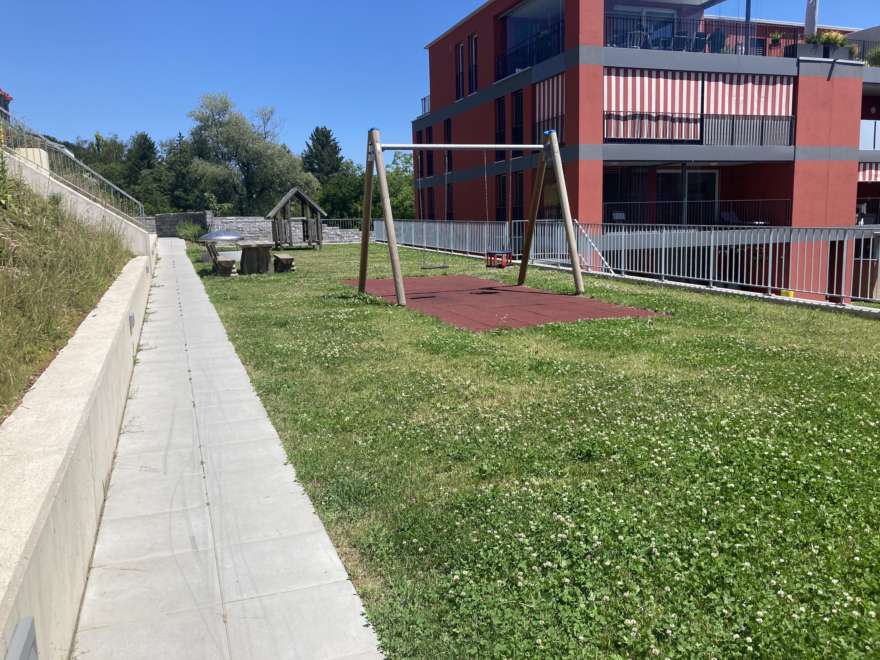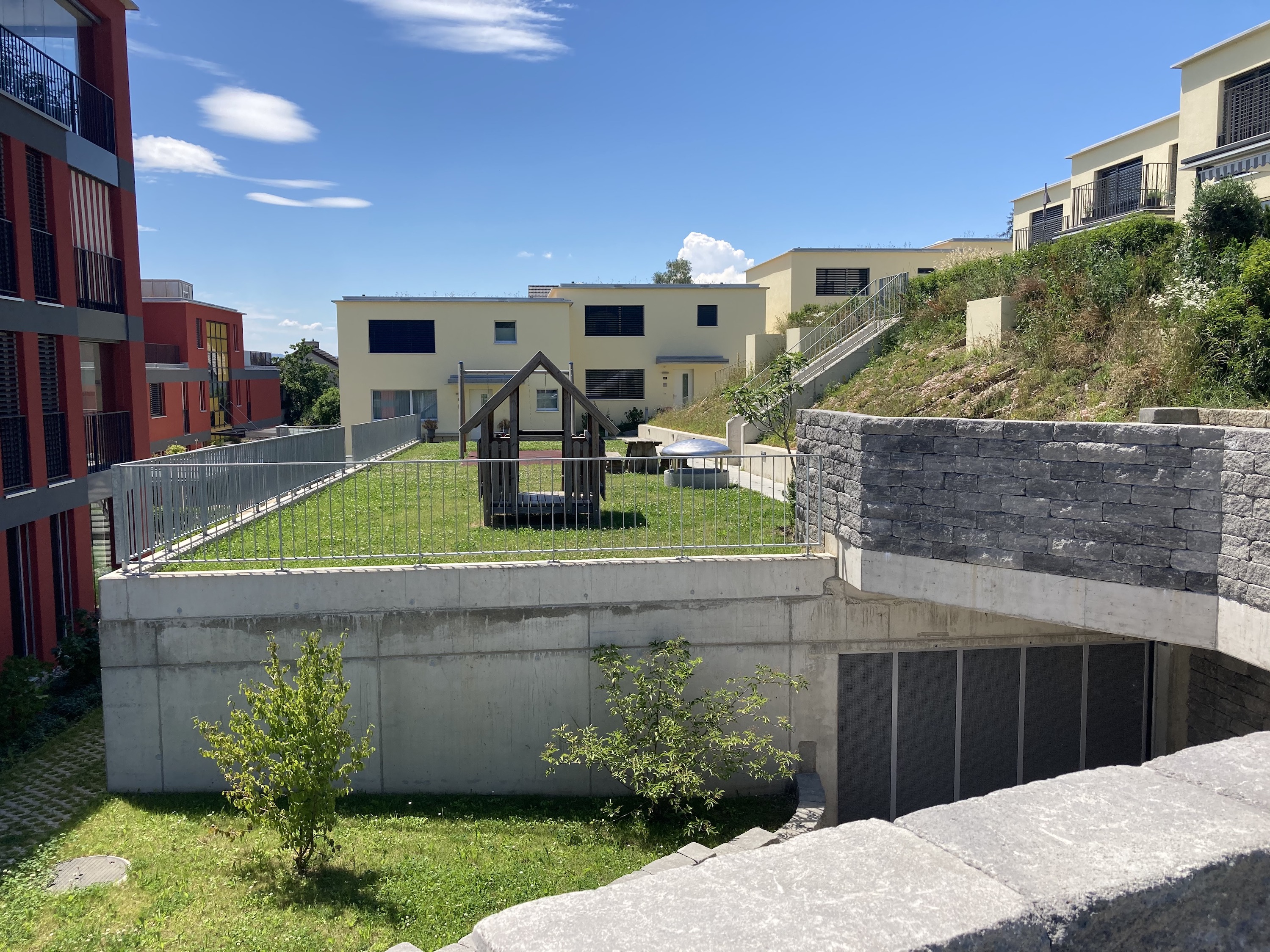 Alle Grünflächen, Spielbereiche und Stützmauern wurden durch uns erstellt. Die Grünflächen gestalteten wir nach dem Wunsch des Bauherren vielseitig.