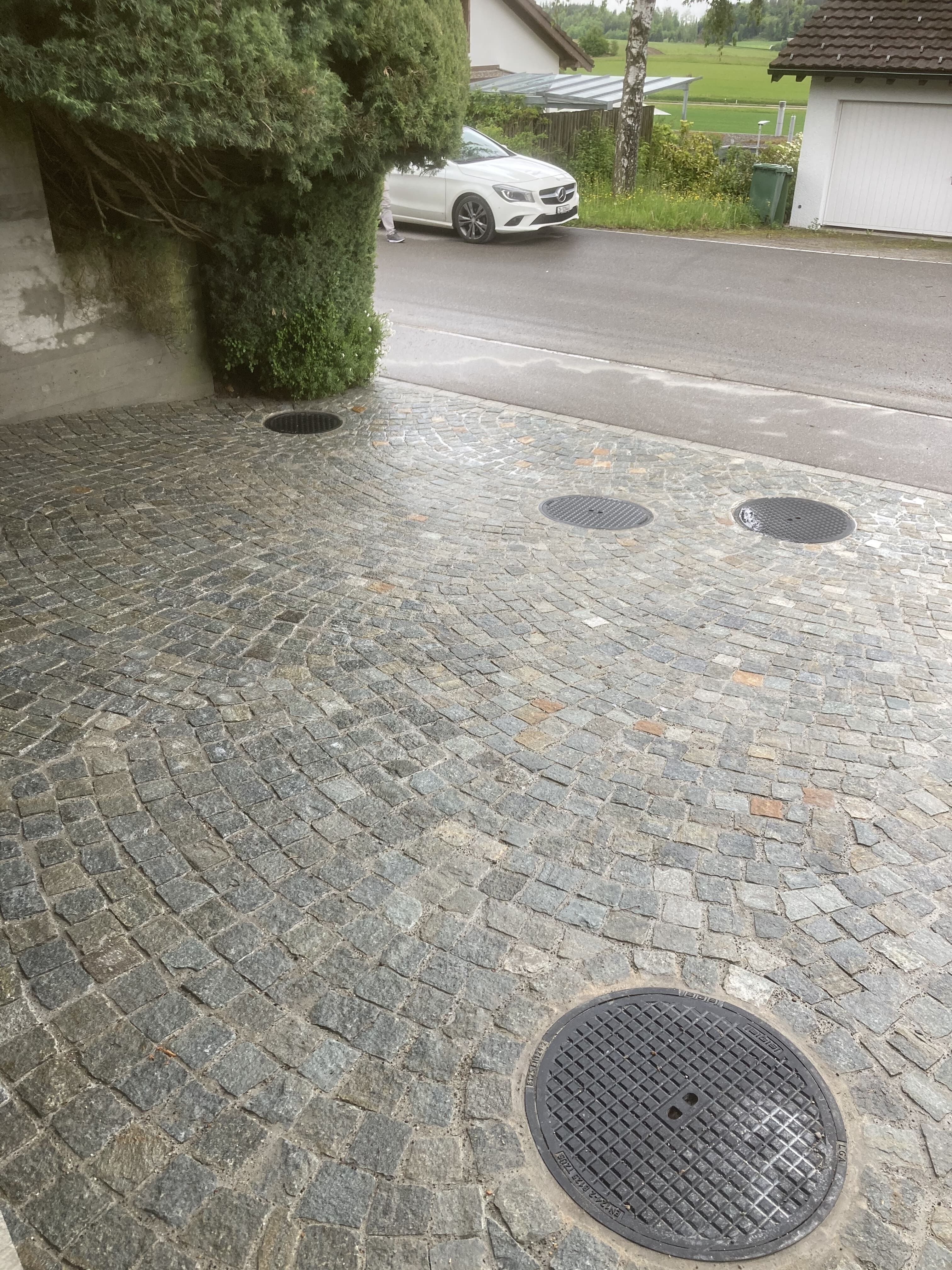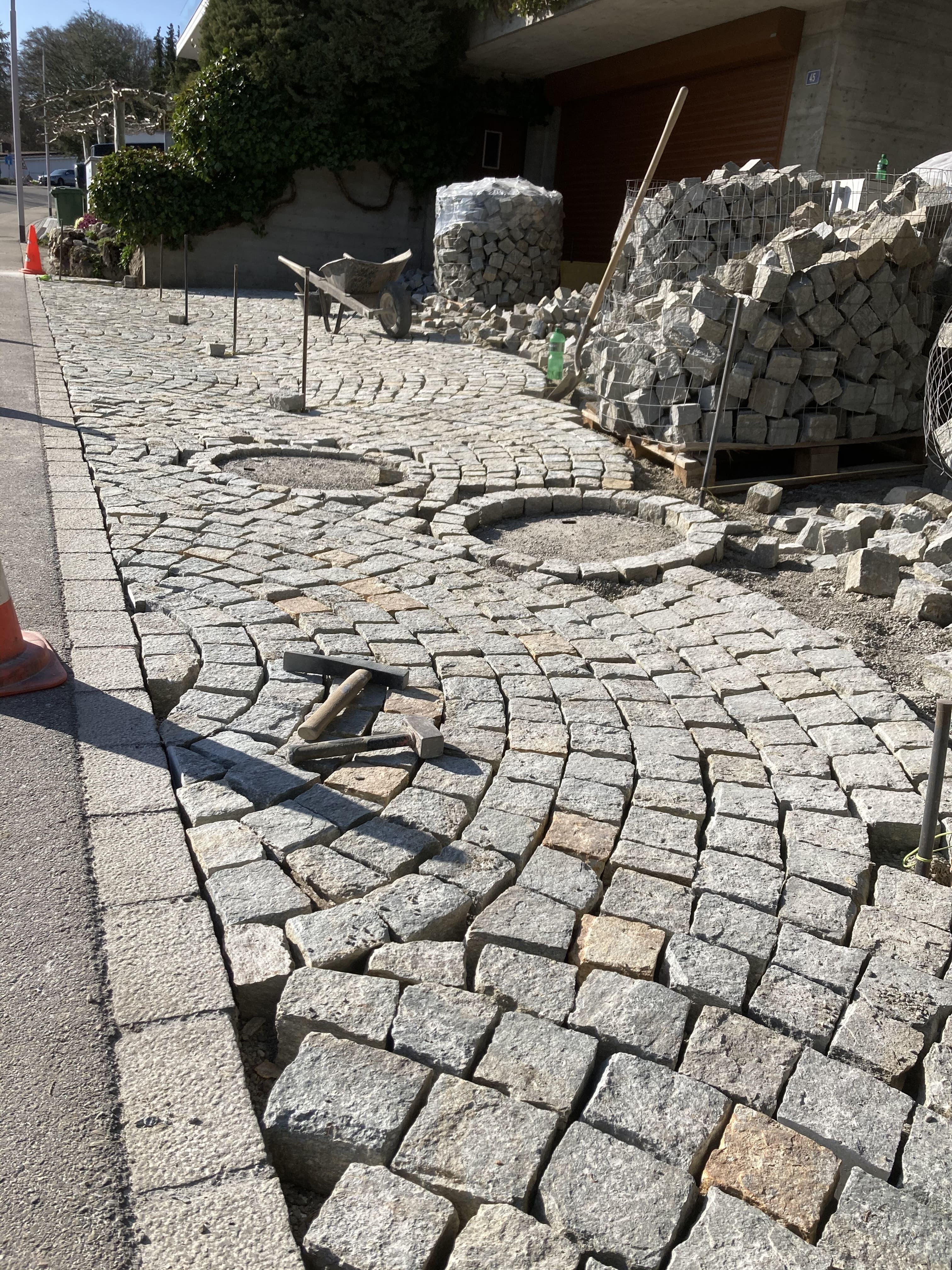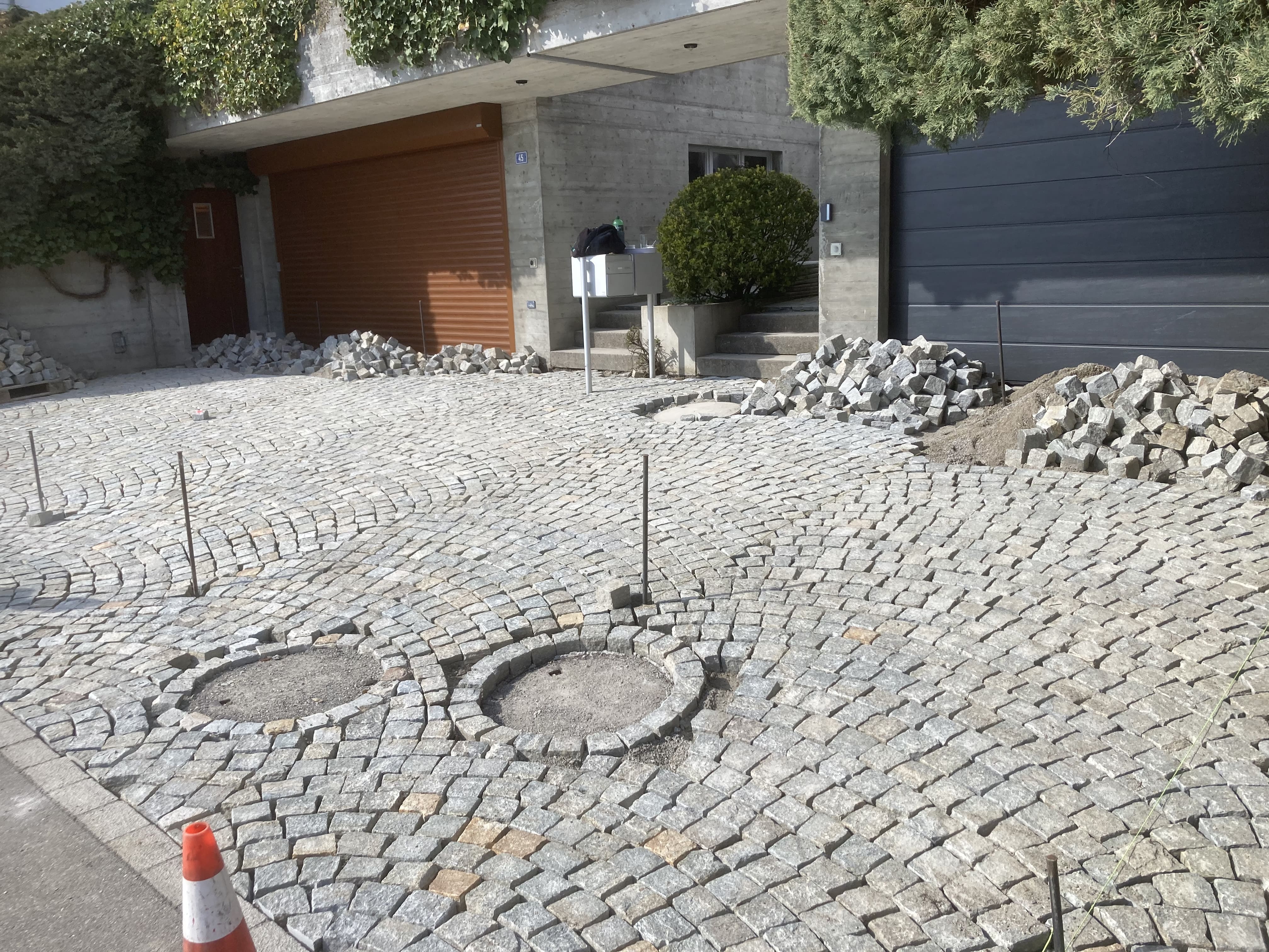 Wir haben den alten Betonpflasterstein-Belag durch eine Bogenpflästerung mit Luserna Gneis ersetzt.