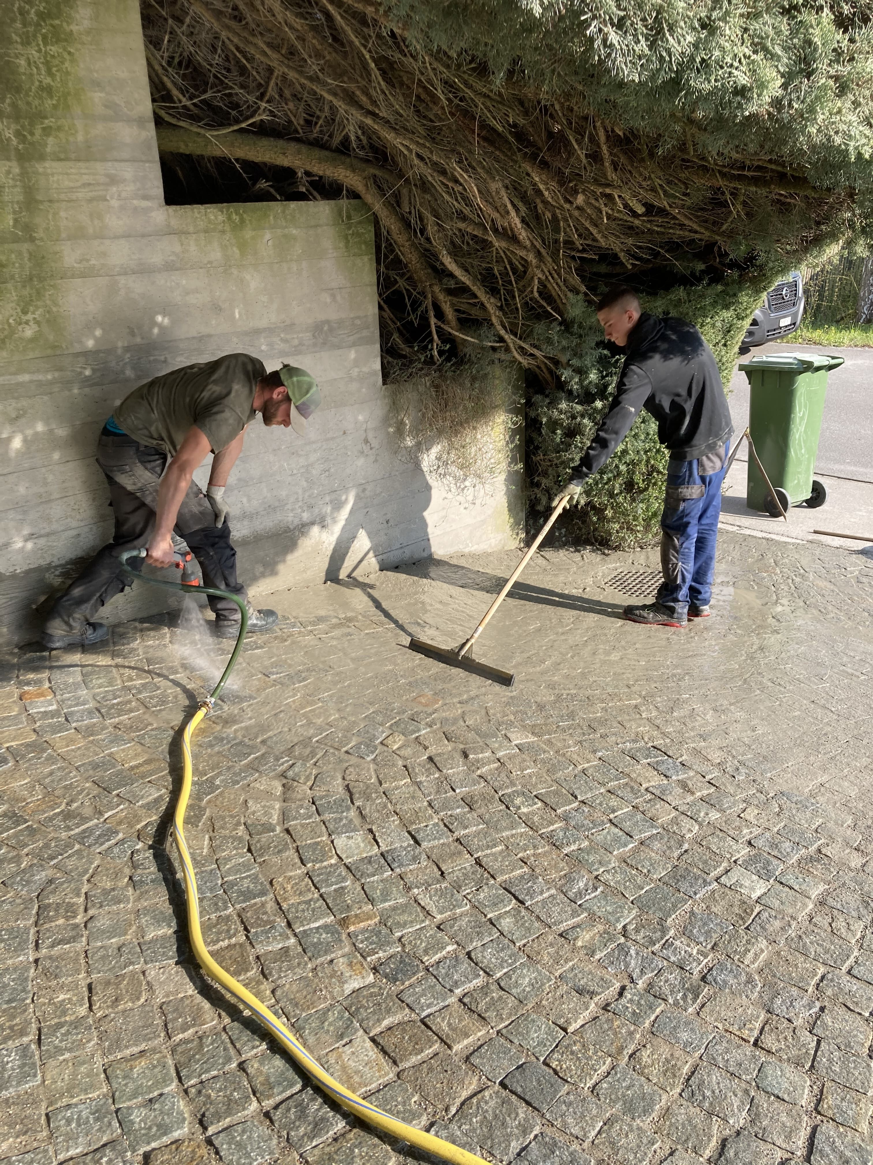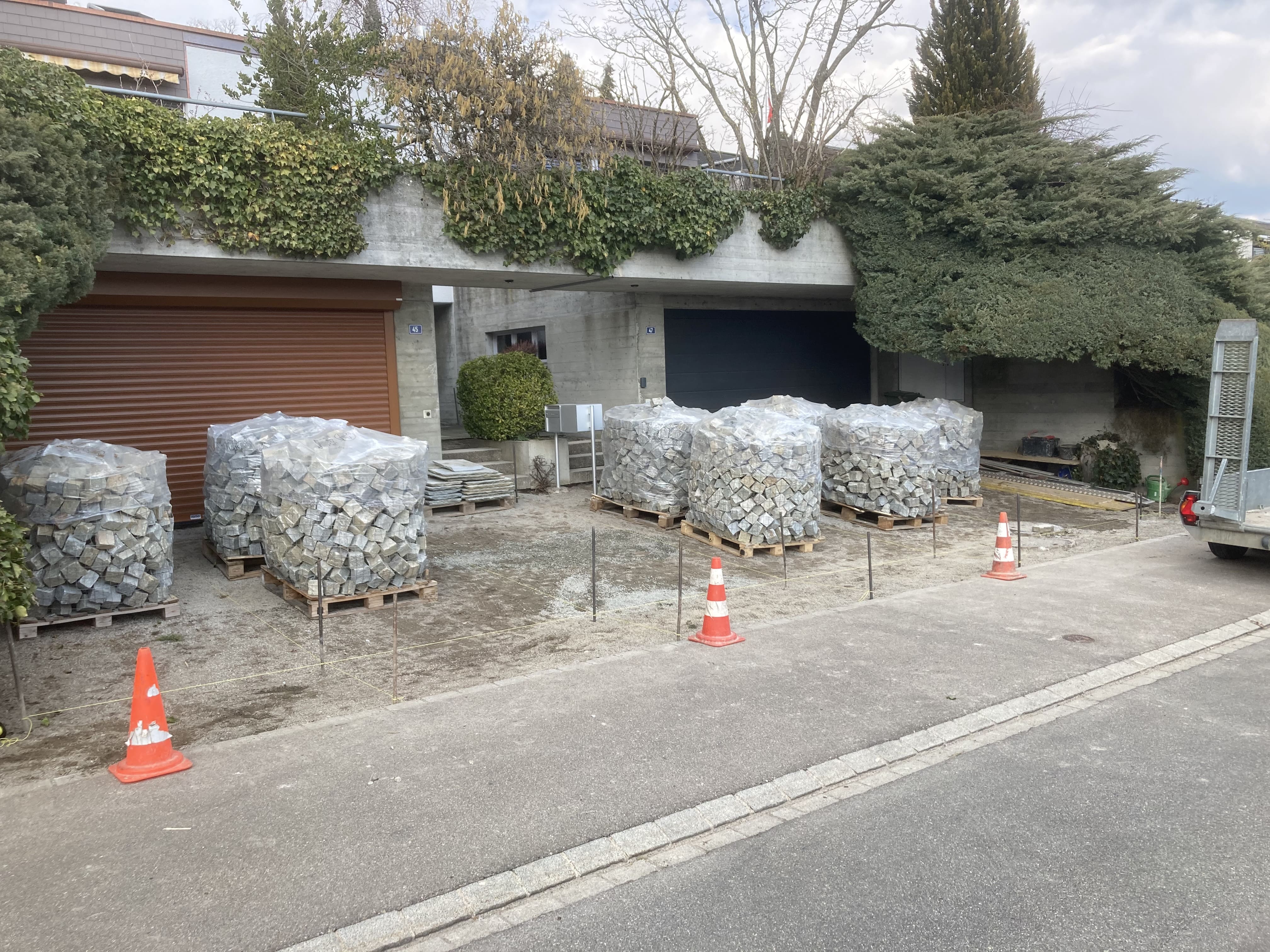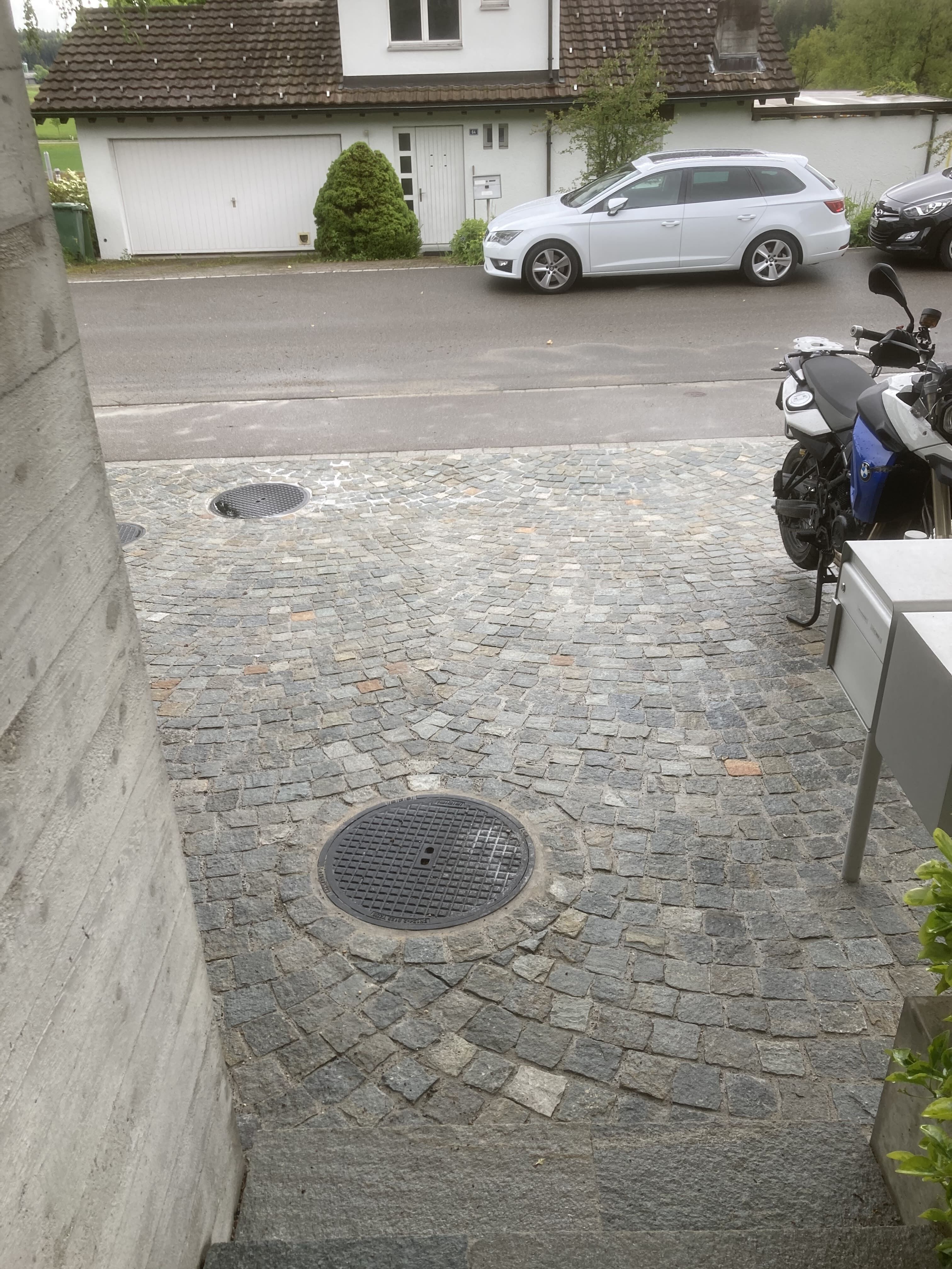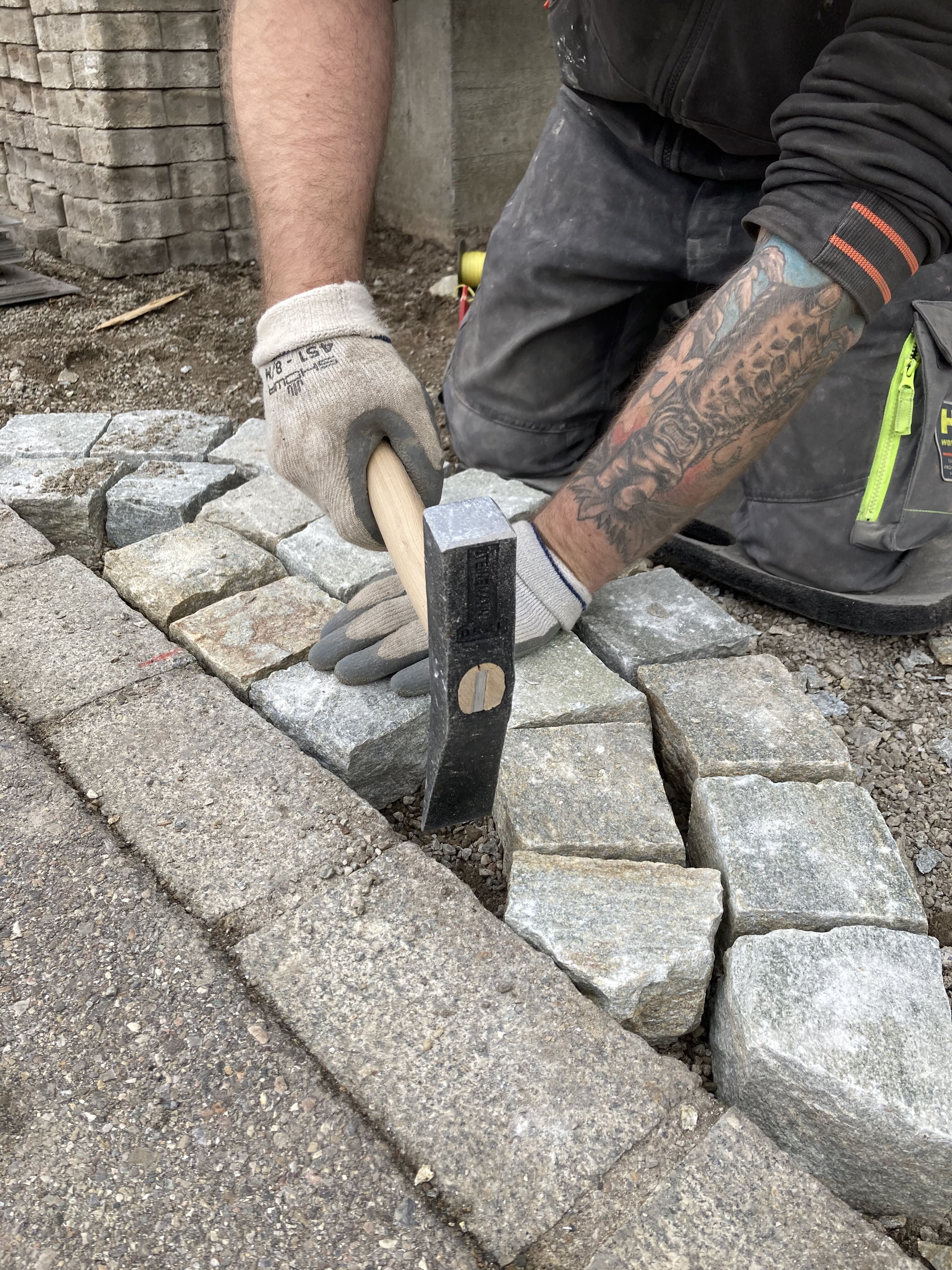 Wir haben den alten Betonpflasterstein-Belag durch eine Bogenpflästerung mit Luserna Gneis ersetzt.