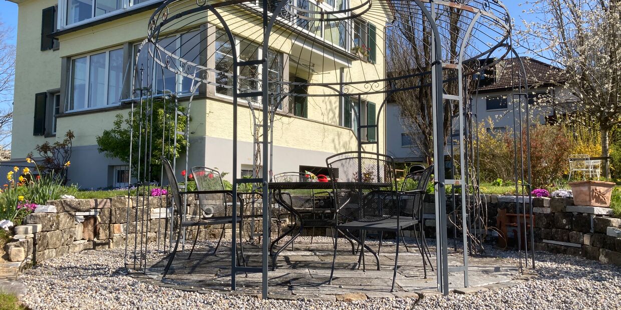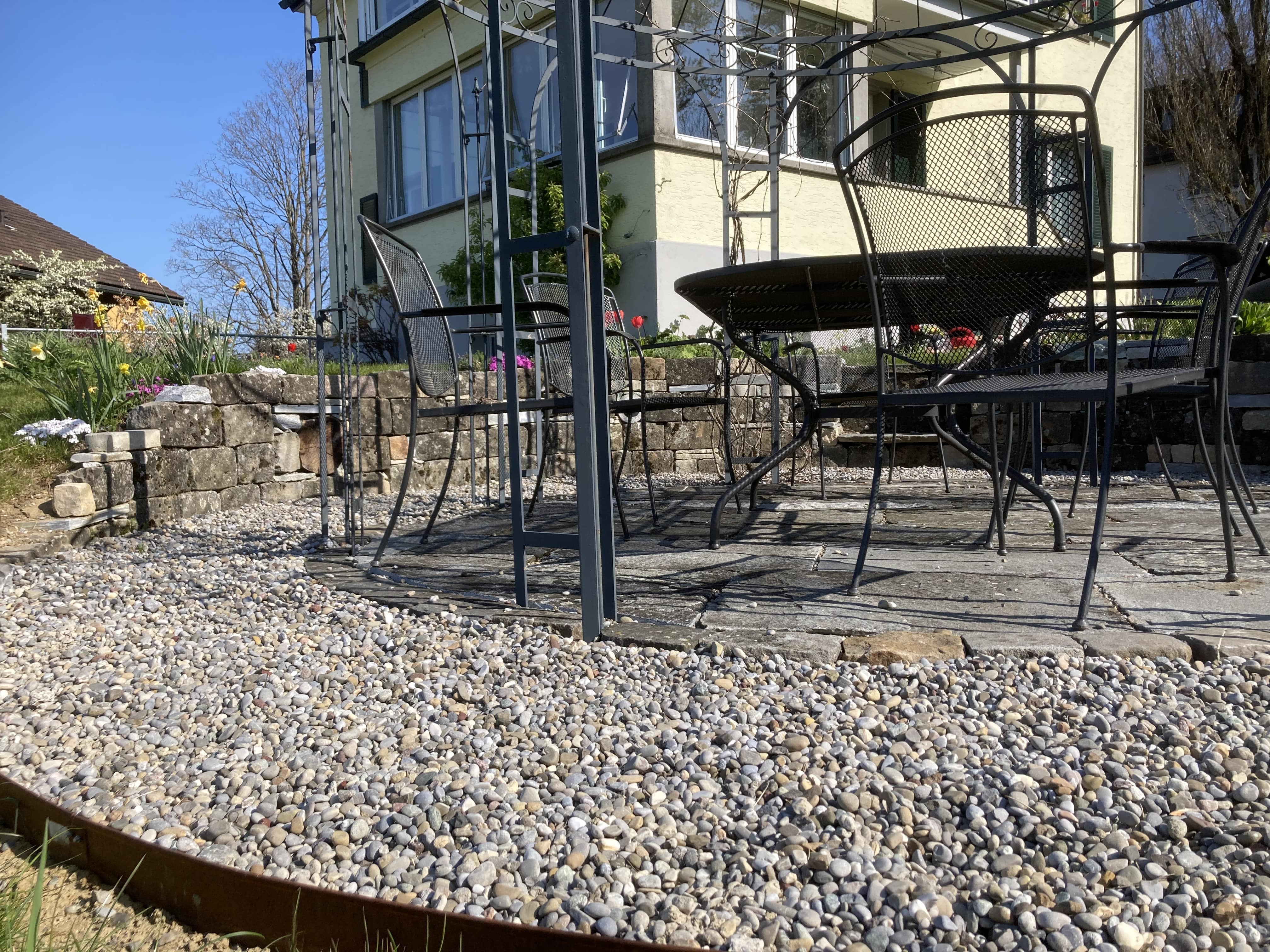 Als Mittelpunkt des Sitzplatzes dient ein Laube aus Metall. Angepasst an die runde Form der Laube wurde eine Recycling Mauer mit wiederverwendeten Steinen aus diesem Garten angelegt. Der Belag des Sitzplatzes besteht aus Gneisplatten, welche zuvor als Trittplatten gedient haben. Zur Böschung hin bildet eine Cortenstahl Rasenkante den Abschluss.